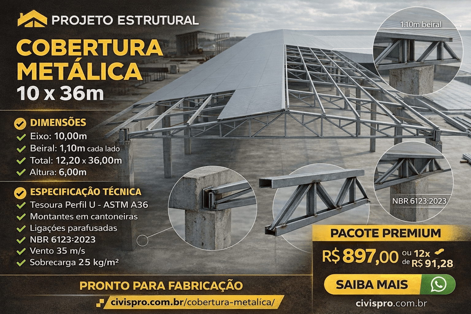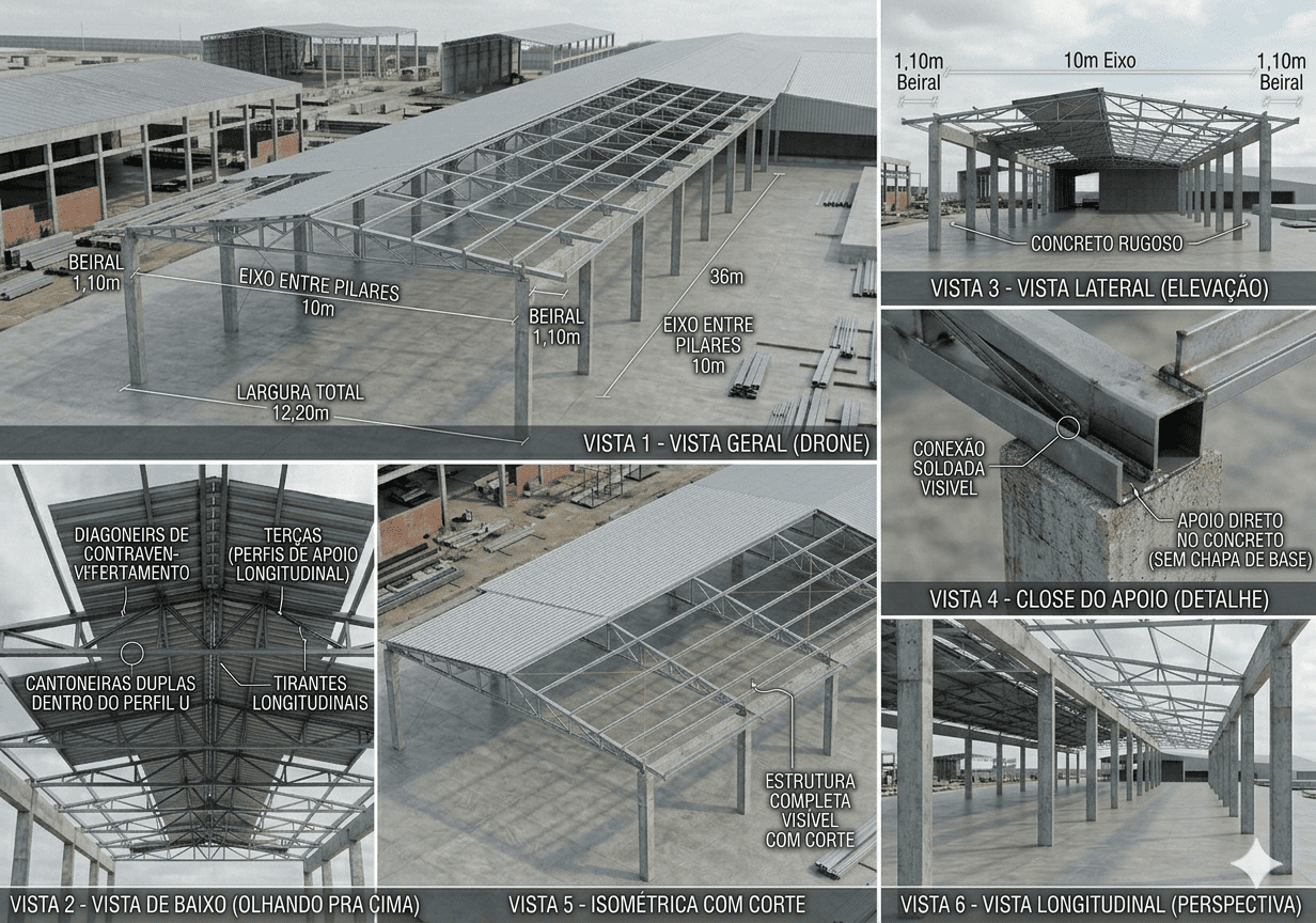 🏗️ Projeto Completo de Cobertura Metálica H=6,00m(apoio) – Estrutura independente com tesouras, sem pilares internos, fechamento lateral, frontal e fundos. Vãos úteis: 10m x36, totalizando 12,20m x 36m com projeção de beiral. Tesoura em banzo externo perfil U ASTM A36 e internos (montantes e diagonais) em cantoneiras, garantindo resistência e fácil fabricação.