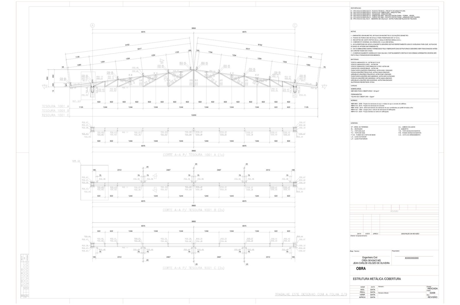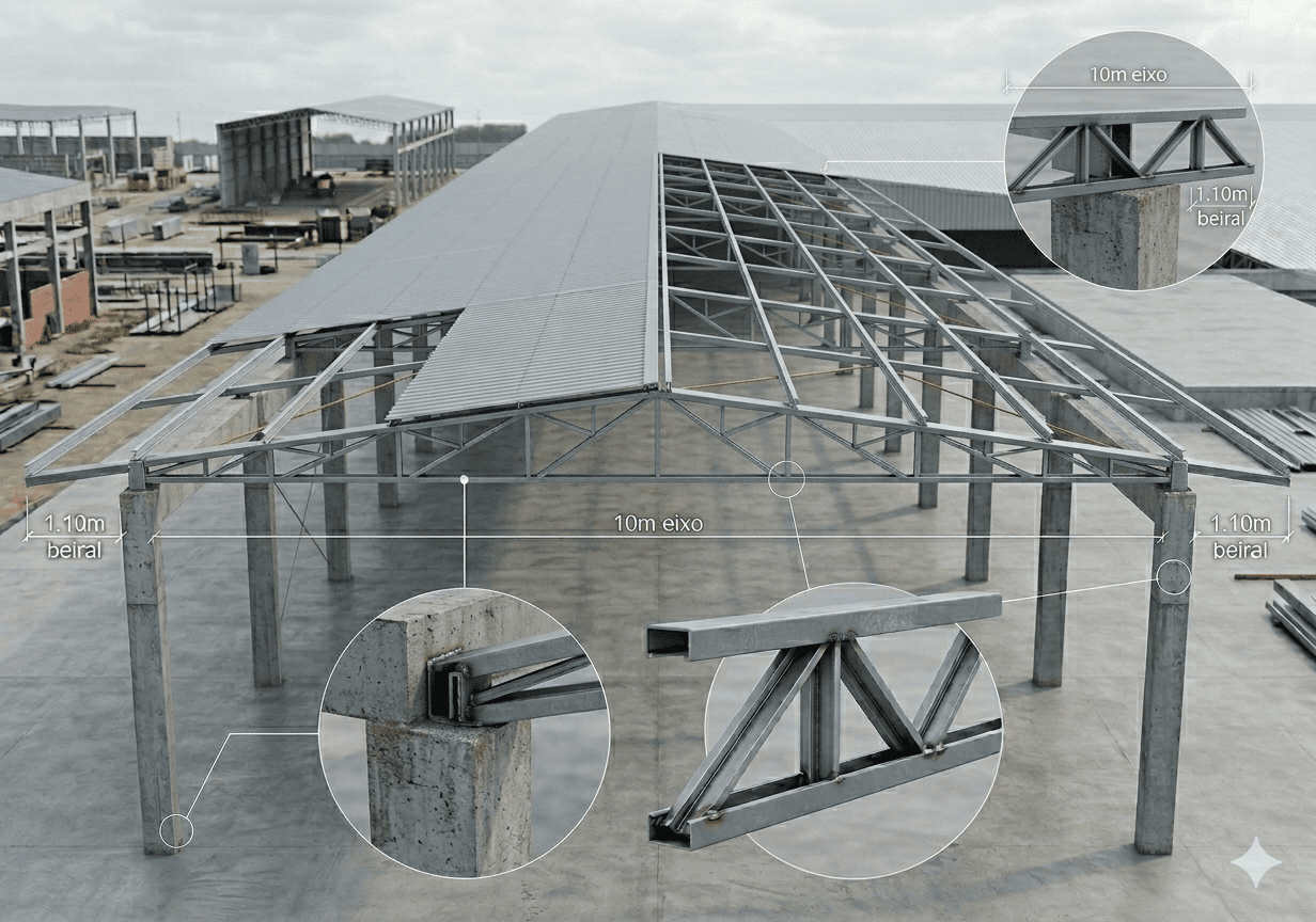 📐 Projeto desenvolvido conforme NBR 6123:2023, considerando vento característico de 35 m/s, fator topográfico, rugosidade, altura da edificação e tipo de ocupação. Inclui ainda a consideração de sobrecarga permanente de 25 kg/m², devendo ser verificado o tipo de telha adotado para obra específica em questão, bem como painéis solares, caso ultrapasse deve verificar a esta variável.