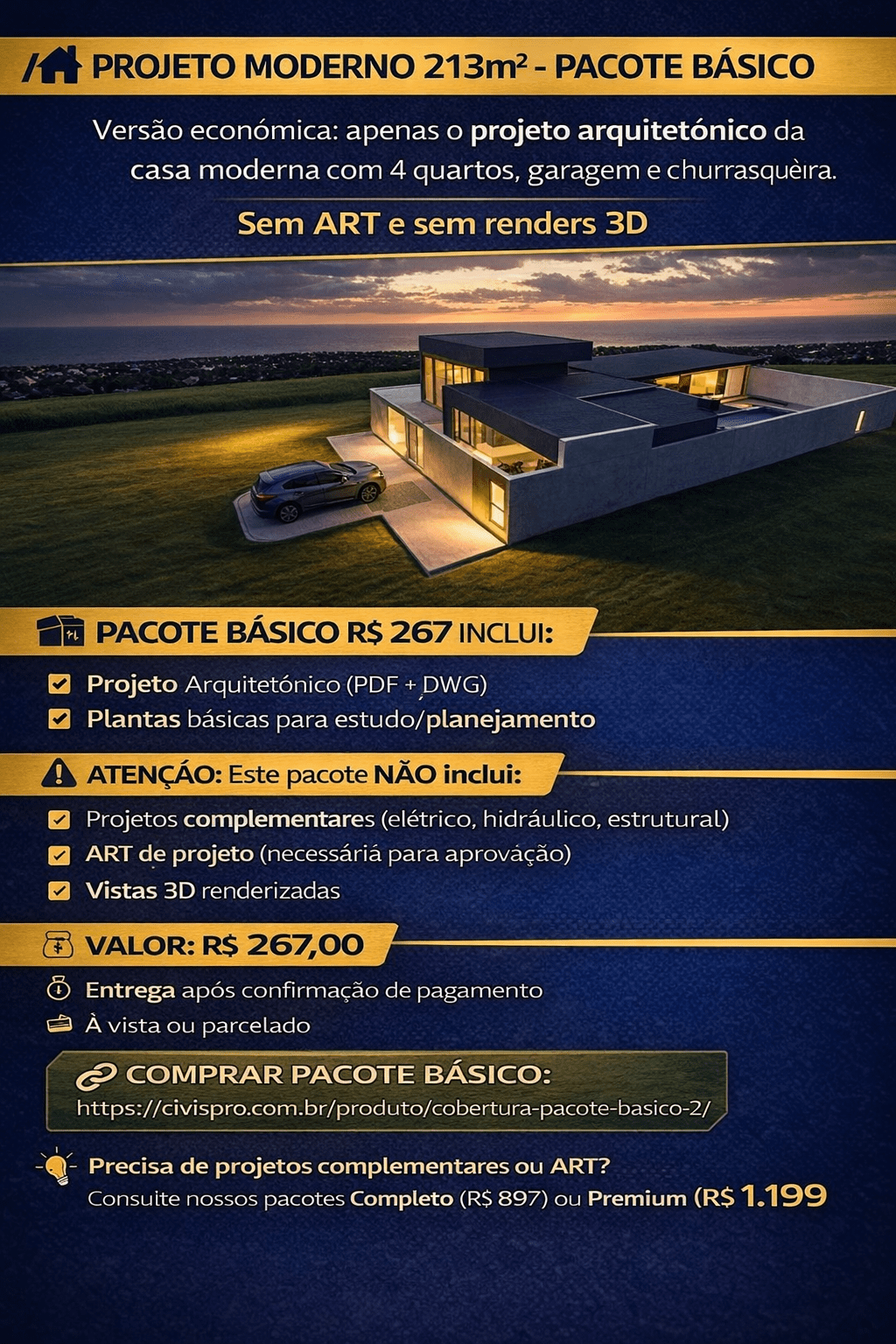 Projeto Moderno 213m² – 4 Quartos, Garagem e Churrasqueira- Pacote Básico