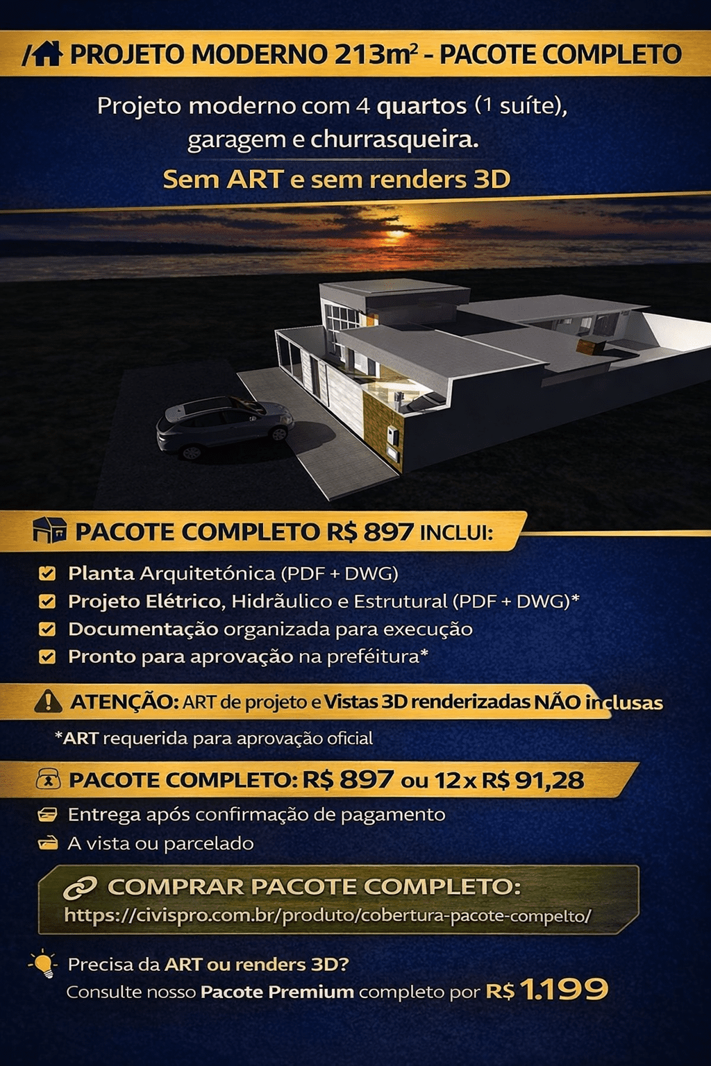 Projeto Moderno 213m² – 4 Quartos, Garagem e Churrasqueira- Pacote Completo