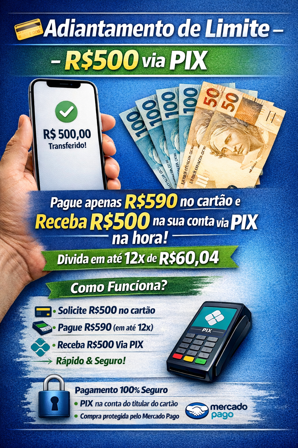 Pague apenas R$590 no cartão hoje, divida em até 12x de R$60,04 e receba R$500 na sua conta via PIX na hora, após a confirmação. É um adiantamento do seu próprio limite, rápido e sem burocracia.