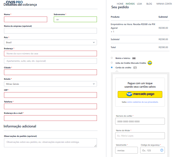 Preencha TODOS os seus dados com atenção. E-mail e telefone são essenciais para receber o PIX e Selecione “Cartão de Crédito”