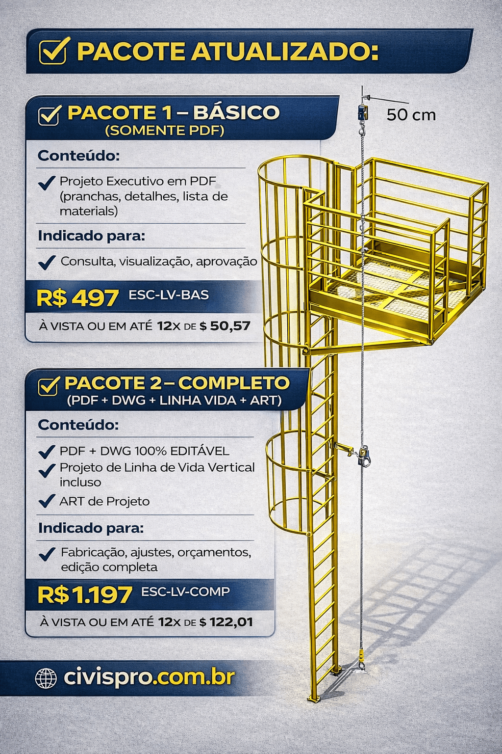 PROJETO ESTRUTURAL COMPLETO – ESCADA MARINHEIRO COM GUARDA CORPO E LINHA DE VIDA VERTICAL