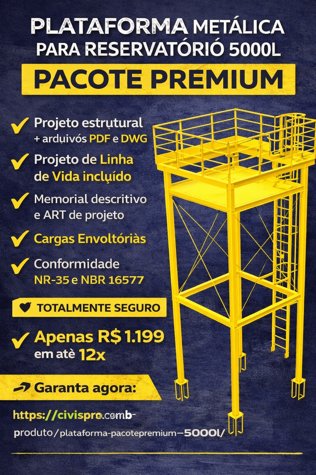 Fornecimento e instalação de uma plataforma de manutenção em estrutura metálica, em formato “L”(passarela), projetada para sustentar um reservatório de água de 5.000 litros. O conjunto inclui todos os elementos de acesso e segurança, sendo um projeto completo e autônomo.
