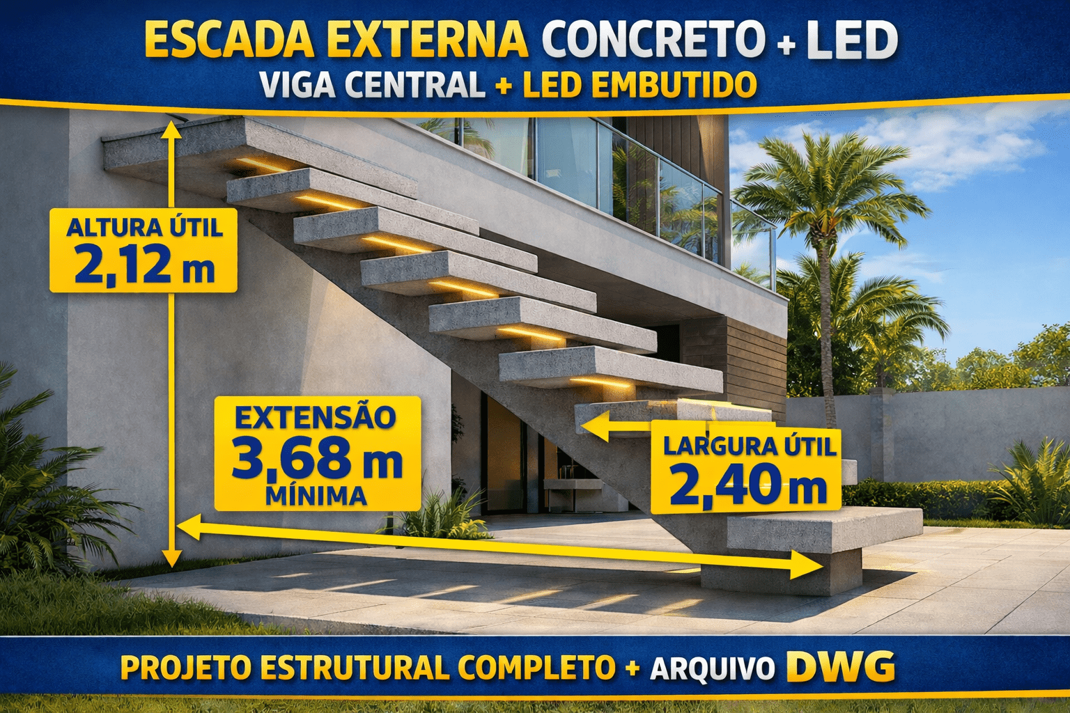 Projeto executivo completo de escada estrutural em concreto armado com viga central e sistema de iluminação em perfil de LED sob os degraus.